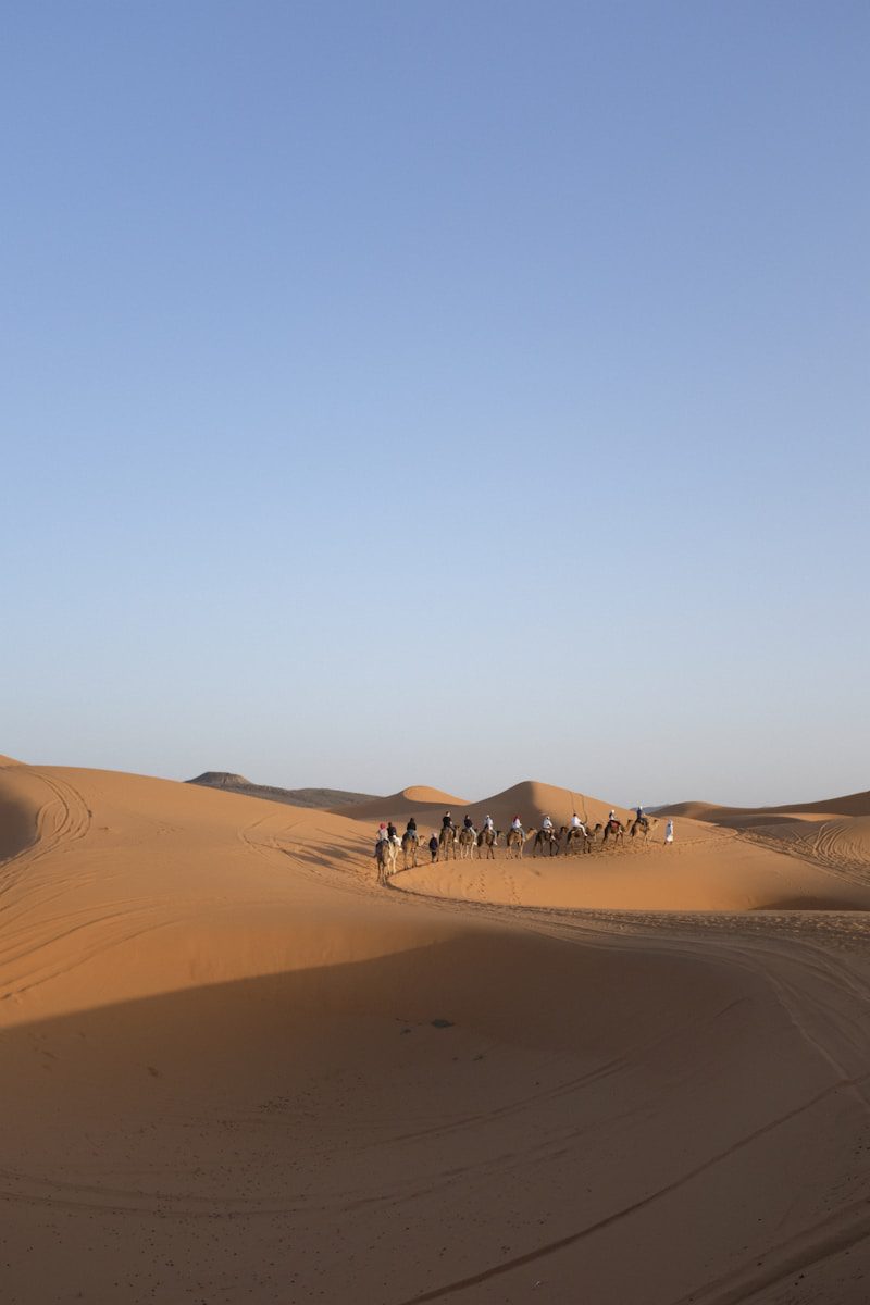 Depart from Ait Ben Haddou and head toward Dades Valley, also known as the Valley of a Thousand Kasbahs. The road winds through dramatic landscapes, where you’ll encounter beautiful rock formations and towering cliffs. Continue to the Todra Gorge, a natural wonder with towering canyon walls, perfect for a scenic walk. After exploring, travel on to Merzouga, located on the edge of the Sahara Desert. Arrive and prepare for a camel trek into the golden dunes of the desert, where you’ll spend the night in a traditional Berber camp under the stars, experiencing local music and culture.